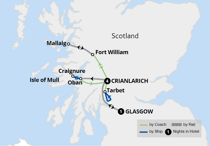 Explore the beauty of Scotland's renowned wonders on this Highland getaway. Our holiday begins amongst the cultural richness of Glasgow before we traverse the Scottish Highlands aboard the West Highland Line and set sail on Loch Lomond. Staying in the serene village of Crianlarich, we discover the historic town of Inveraray, visit Duart...