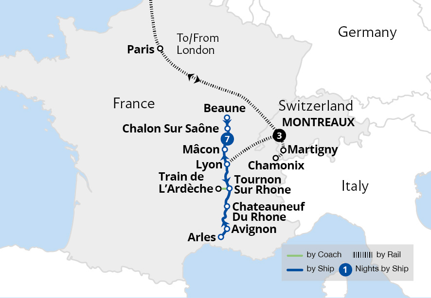 Making your way home, you can look back on the historic Château de Chillon and our time cruising Lake Geneva's stunning waters to Montreux. We traversed the Alps aboard the Mont Blanc Express to Chamonix and savoured Burgundy's wine in Beaune. After exploring Lyon's gastronomic delights we sailed to Avignon, Arles, and the Ardèche Gorge, immersing in history and natural beauty.